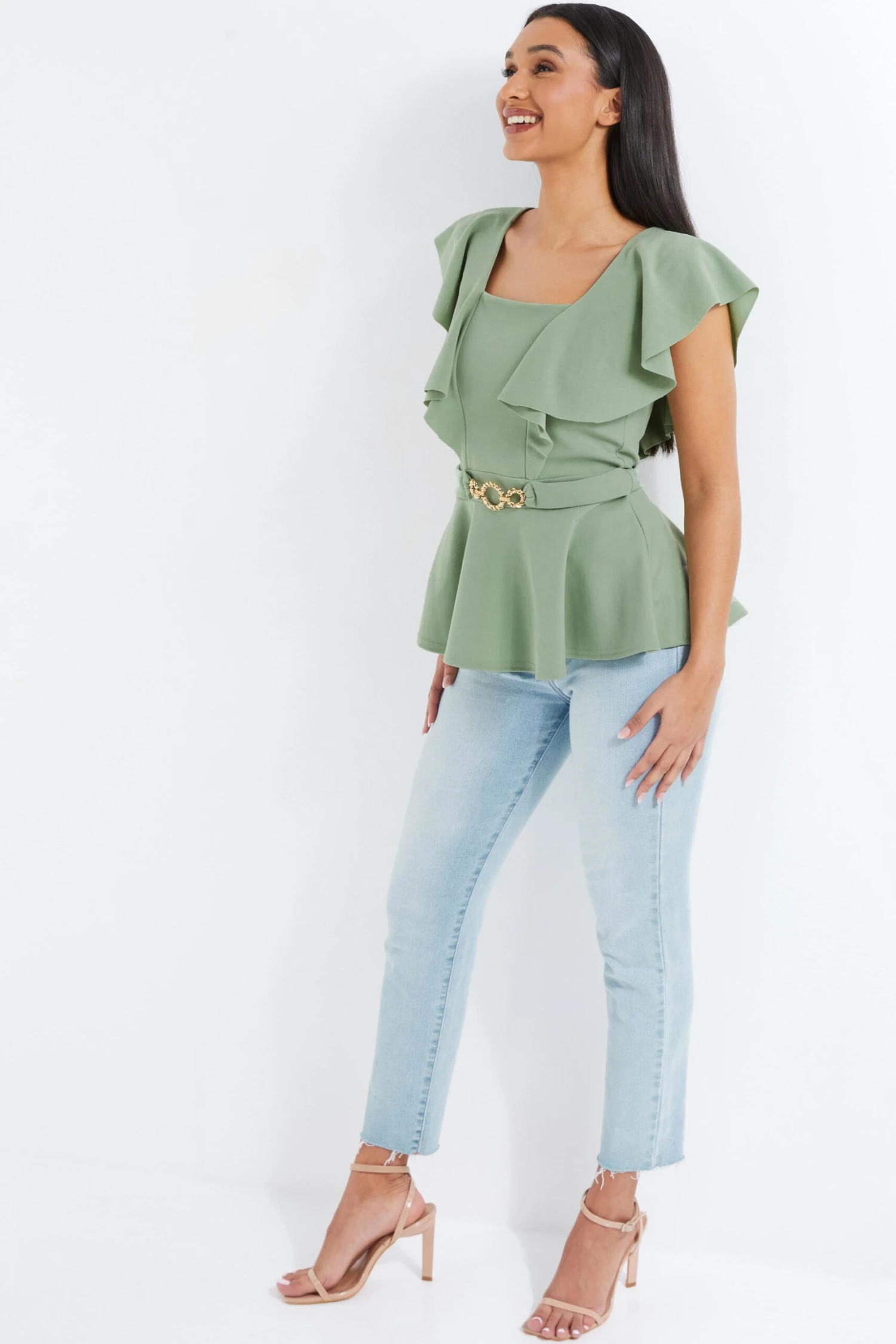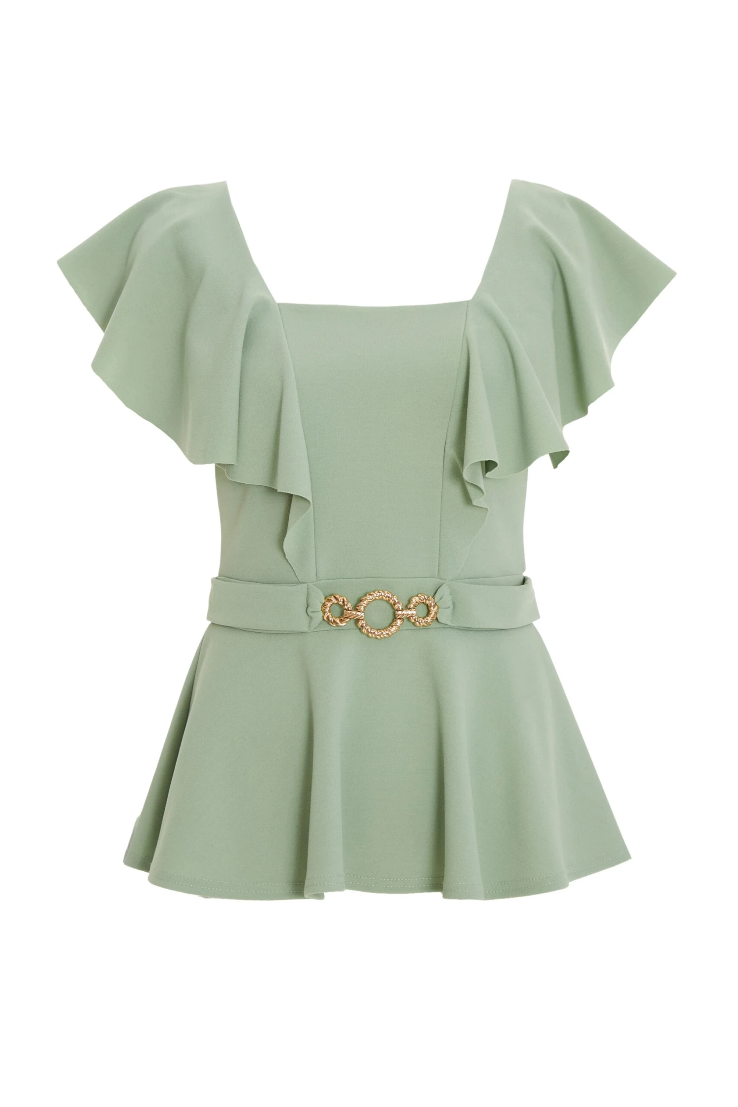 Sage Frill Sleeve Buckle Peplum Top